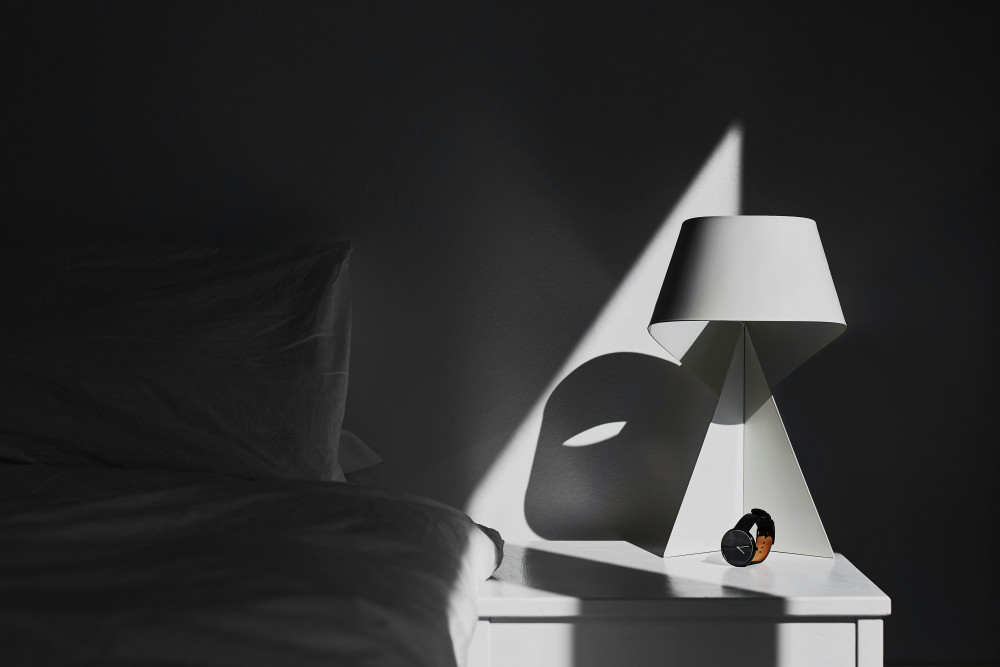 Lampan står på tre smala metallben som ger ett lätt och elegant uttryck. Kombinationen av textil, aluminium och stål gör konstruktionen både stabil och visuellt balanserad.