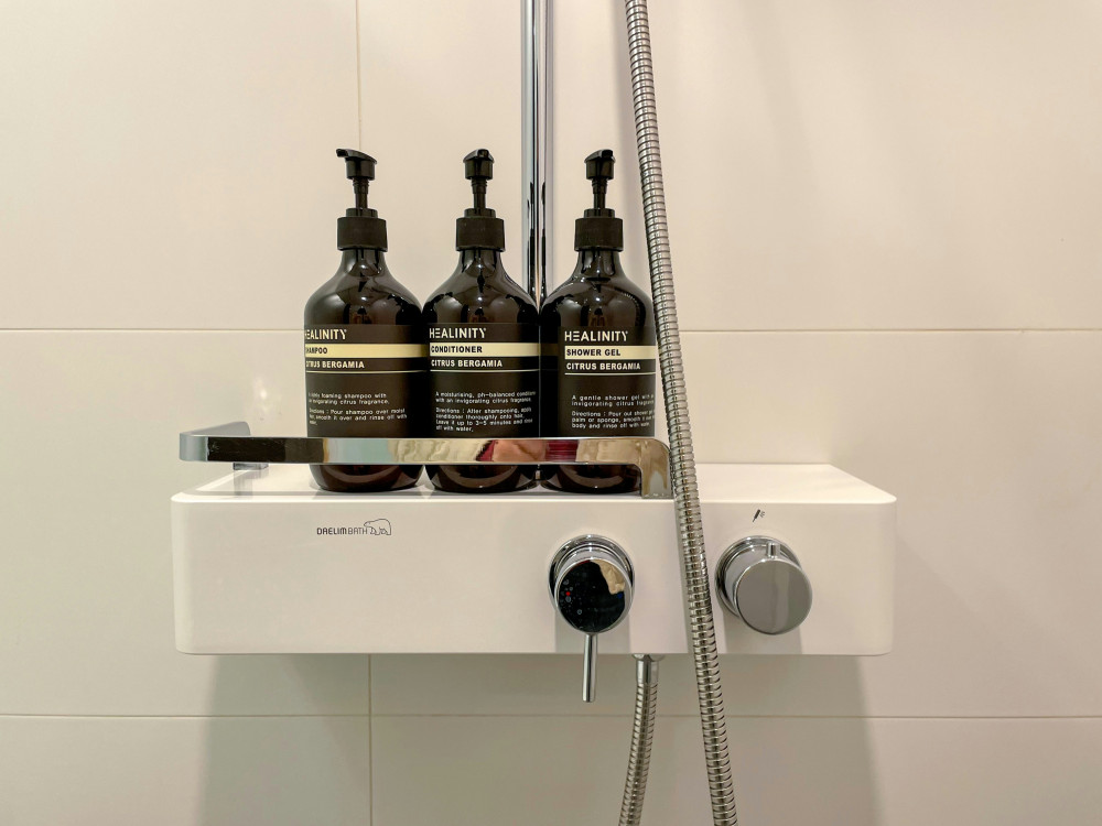 Duschsystemet kan användas med genomströmningsvärmare på 18 kW/h och har ett minimiflöde på 7 liter per minut. Dessutom kan det kompletteras med en valfri EasyReach-hylla för förvaring av duschprodukter.